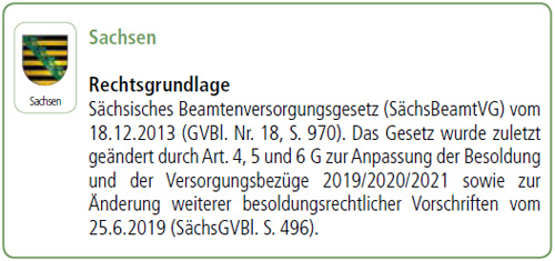 Sächsisches Beamtenversorgungsgesetz (SächsBeamtVG) vom 18.12.2013 (GVBl. Nr. 18, S. 970). Das Gesetz wurde zuletzt geändert durch Art. 4, 5 und 6 G zur Anpassung der Besoldung und der Versorgungsbezüge 2019/2020/2021 sowie zur Änderung weiterer besoldungsrechtlicher Vorschriften vom 25.6.2019 (SächsGVBl. S. 496).